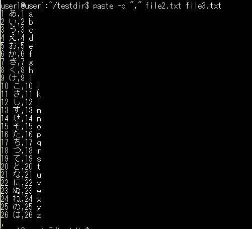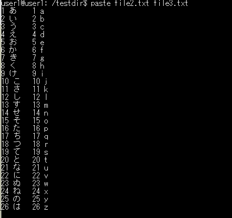 pasteコマンドは、行単位でファイルを横方向に結合するコマンドです。