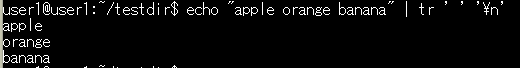 2. スペースを改行に変換:echo "apple orange banana" | tr ' ' '\n'