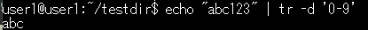 3. 特定の文字を削除(-dオプション):echo "abc123" | tr -d '0-9'