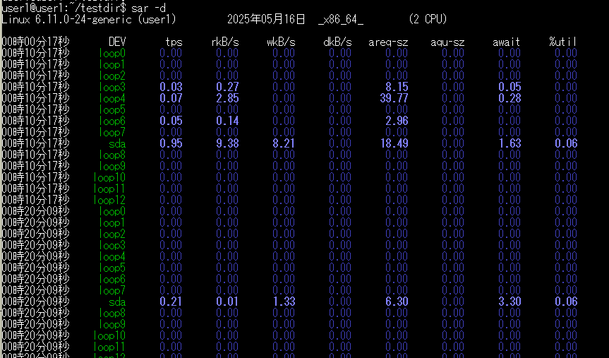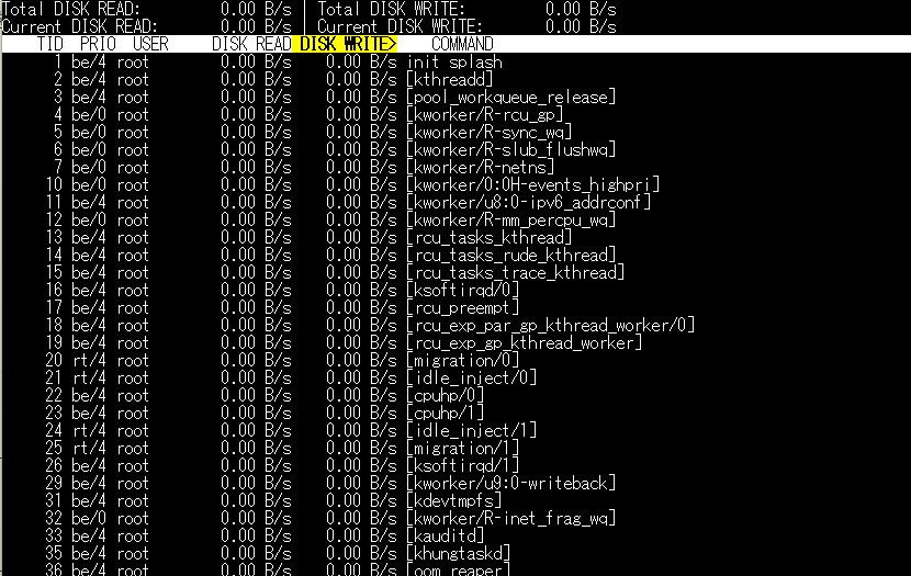 %utilが 80% 以上ならI/Oが逼迫している可能性。iotopで読み書きが多いプロセスを特定。