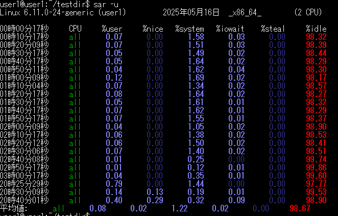 top:リアルタイムでCPUやメモリ、プロセス情報を表示。htop:topの強化版。操作性が高く、色分けで見やすい。ps:現在のプロセス情報を一覧表示。sar:CPU利用率の履歴データを確認。