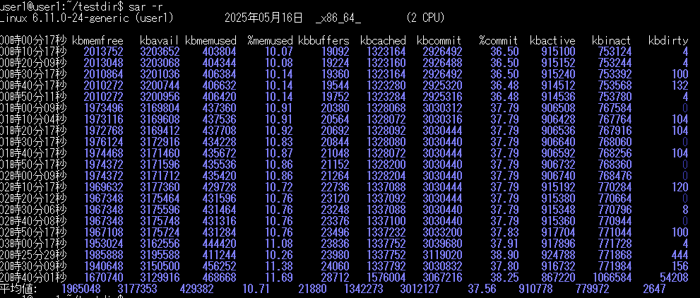 free:メモリとスワップの使用状況。vmstat:メモリ、スワップ、プロセス、I/O、CPUを確認。sar -r:メモリ使用履歴を表示。